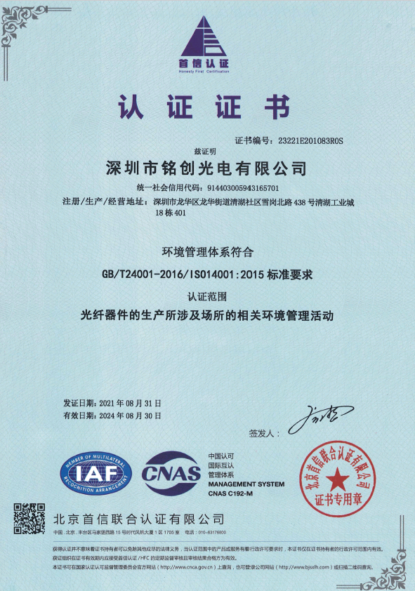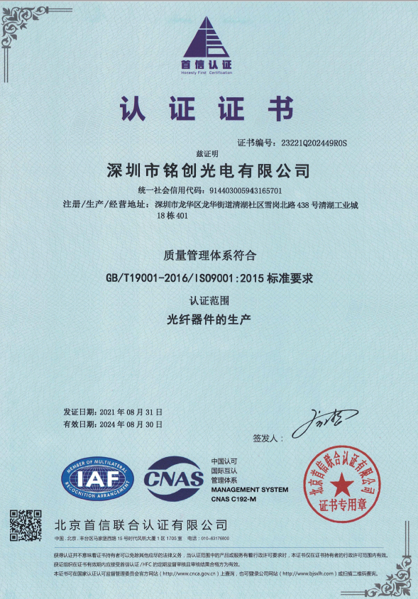 深圳市銘創(chuàng)光電有限公司于2012年成立,公司總部位于深圳市光明區,是一家國家級高新技術企業,通過了IS09001-2015質量管理體系認證和IS014001-2015環(huán)境管理體系認證;經過多年的持續(xù)研發(fā)投入和專注發(fā)展,銘創(chuàng)光電已逐漸成為光纖激光器、光纖傳感、激光雷達和激光通信等領域的綜合性產品服務商。 公司目前設立有光無源器件研發(fā)生產中心和激光研發(fā)生產中心。無源器件研發(fā)生產中心設有有高標準的無塵車間,可提供各種波長的無源光纖器件、高功率光纖器件、保偏光纖產品、超小型光纖器件。激光研發(fā)中心建立在安徽合肥市,研發(fā)生產特殊波長的激光光源、光纖激光器、光纖放大器以及新產品的技術研究儲備。研發(fā)生產中心與多地科研單位合作,能夠迅捷高效的為客戶提供相